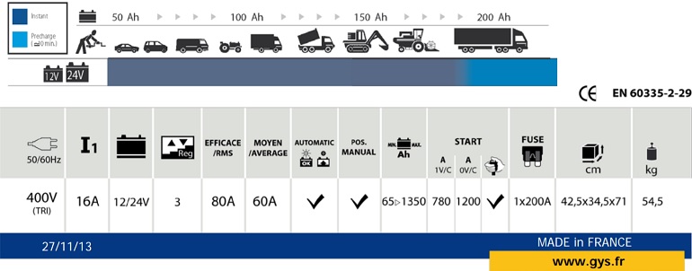 The Gystart 1224T is a three-phase machine that permits to abtain a filtered current near the linear current.CHARGER Automatic loading : in “ Electronic control” position, this device loads without supervision and it assures a better protection of the batteries and of the on-board electronic of the vehicle. It can be connected permanently thanks to a regulation by indication of loading. Diagnostic indicator : loading / battery loaded. Manual loading : loading with supervision and manual stop by the user. It permits a reloading without voltage limitation in order to restore discharged and sulphated batteries or to make rapid