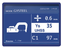 GYSTEEL MODE Đo độ cứng thu được với thiết bị Vision GYSTEEL có thể được nhập trực tiếp trong menu này để chỉ định loại thép. Các máy xác định các thông số hàn. |