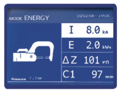 ENERGY MODE Chế độ này cho phép kiểm soát năng lượng được truyền trong điểm hàn. Chỉ có dòng hàn (A) và năng lượng (kW) có thể được thiết lập để làm cho điểm hàn. Chế độ này đã được thiết kế cho các phòng thí nghiệm thử nghiệm và các nhà sản xuất ô tô, cho mục đích phê duyệt. |